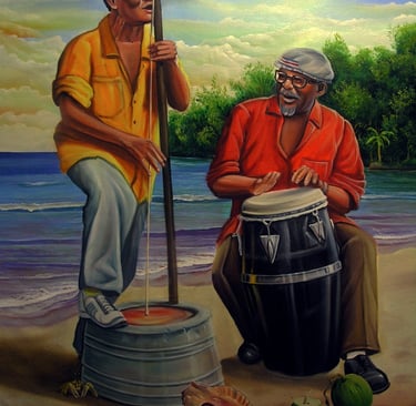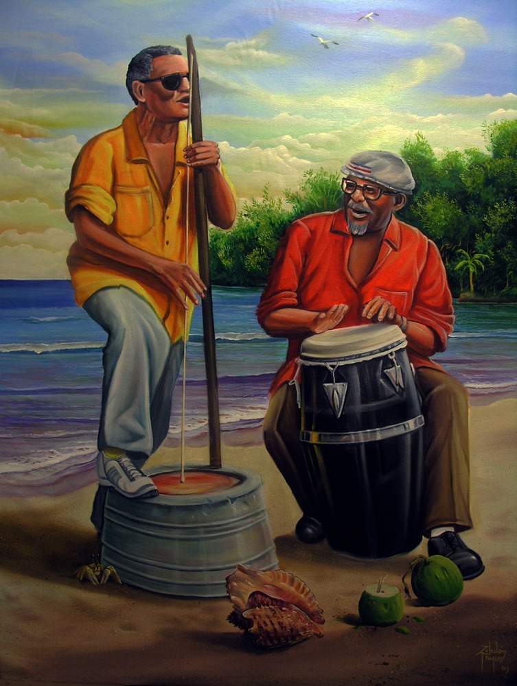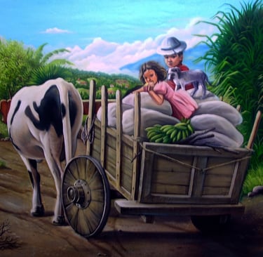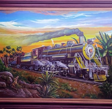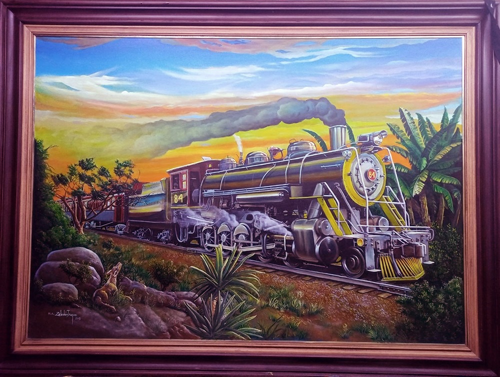 PINTURA AL ÓLEO "MÁQUINA HISTÓRICA DE GOLFITO, PALMAR SUR"